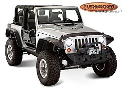 Be ready for anything - equip your Jeep Wrangler with Bushwacker Flat Style Fender Flares. They're the first and only flat style flares made to absorb impact, using our proprietary Dura-Flex® 2000 TPO - the thickest, most flexible material available. Flat Style Fender Flares maximize your tire coverage and wheel articulation for severe off-road use. Yet they're carefully engineered to install with a minimum of extra tools and bodywork (see the installation guide for your specific vehicle for details). For example, our mounting brackets bolt straight onto your Jeep for added strength and simpler fitting. Our design integrates neatly with the factory rocker guards, and incorporates DOT-compliant LED side marker lights and fully molded wheel well protection. The flares are 100% UV protected, too, to stop chalking in its tracks. If you want the look - and the real-world performance - that best fits an American icon, nothing goes with your Jeep better than Bushwacker Flat Style Fender Flares.